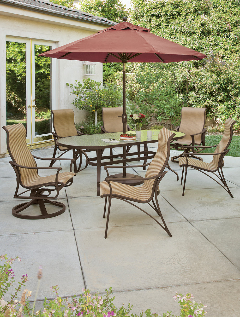 With graceful, flowing curves and subtle end-of-arm rolled detailing, the Corsica Sling/Padded Sling seating collection complements any decor. Designed by Peter Homestead, the simple and refined styling makes this patio furniture set perfect for poolside lounging or socializing on the patio. This collection of sling or padded sling patio furniture includes outdoor dining chairs, swivel chairs and glider. Corsica Sling/Padded Sling provides a relaxing, durable seating solution with lightweight aluminum frames powder-coated in any Tropitone® Standard or Premium Finish and your choice of of fabric.