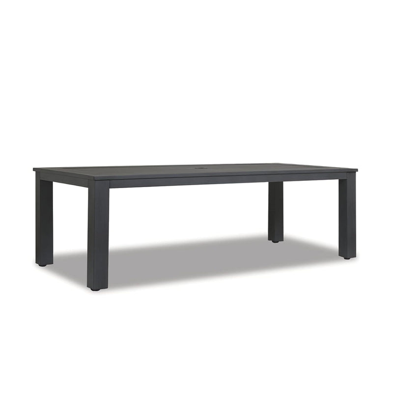 This collection blends modern and industrial sensibility into one striking design, featuring a slat table top and linear frame, crafted in powder coated aluminum in a hand-brushed Slate finish.