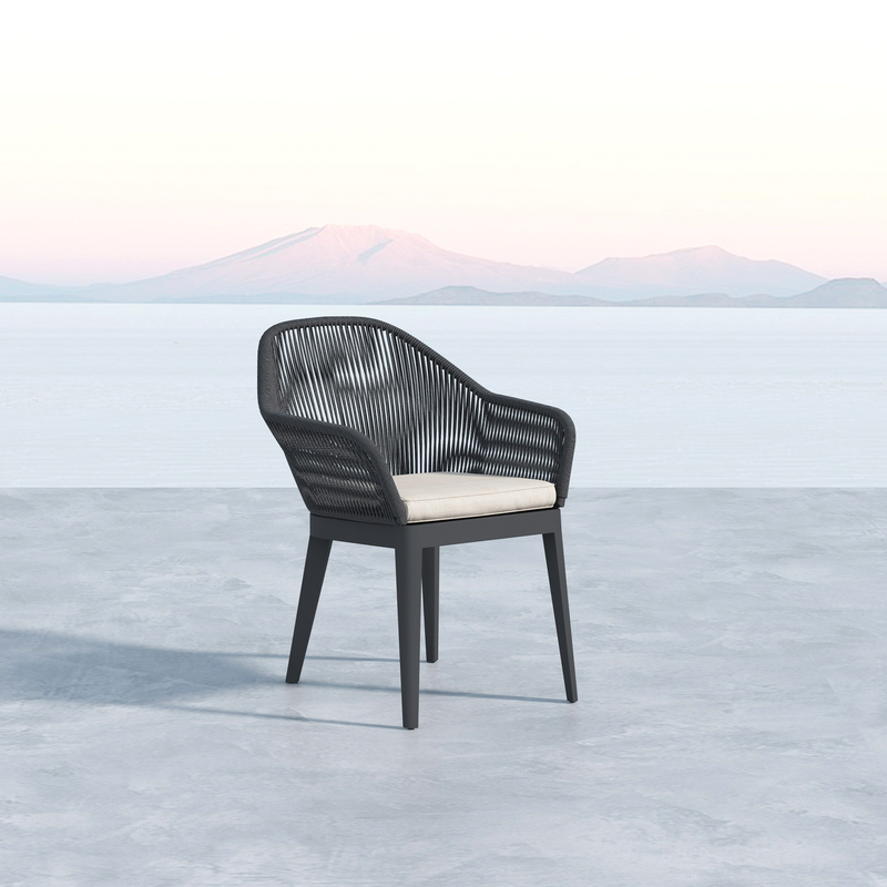 Crafted in the highest quality comfort and durability, the Milano Dining Chair will stand the test of time with minimal maintenance. Its curved powder coated aluminum frame is expertly wrapped with premium all-weather olefin rope in a charcoal-grey finish, and is finished with a slate tapered leg.