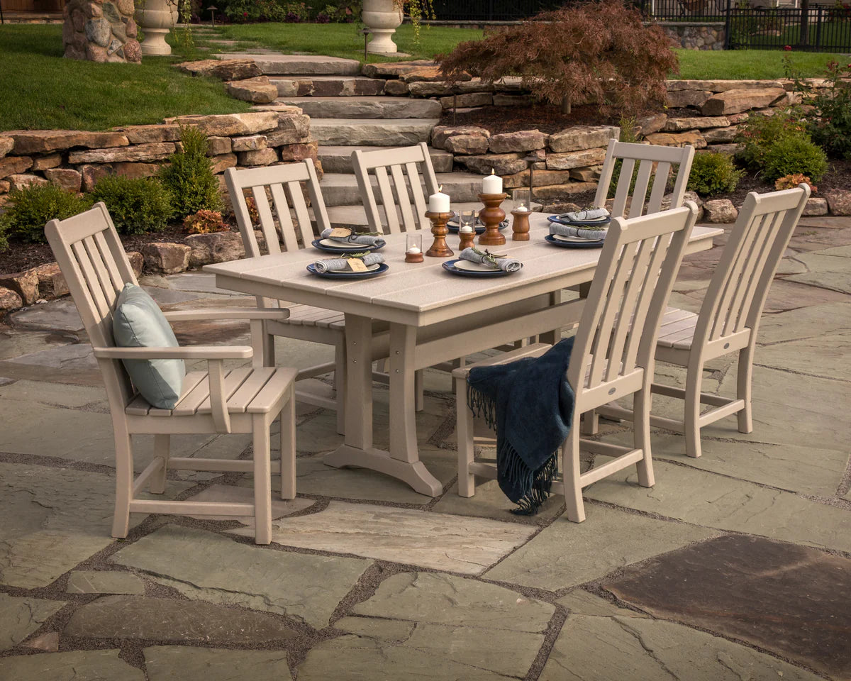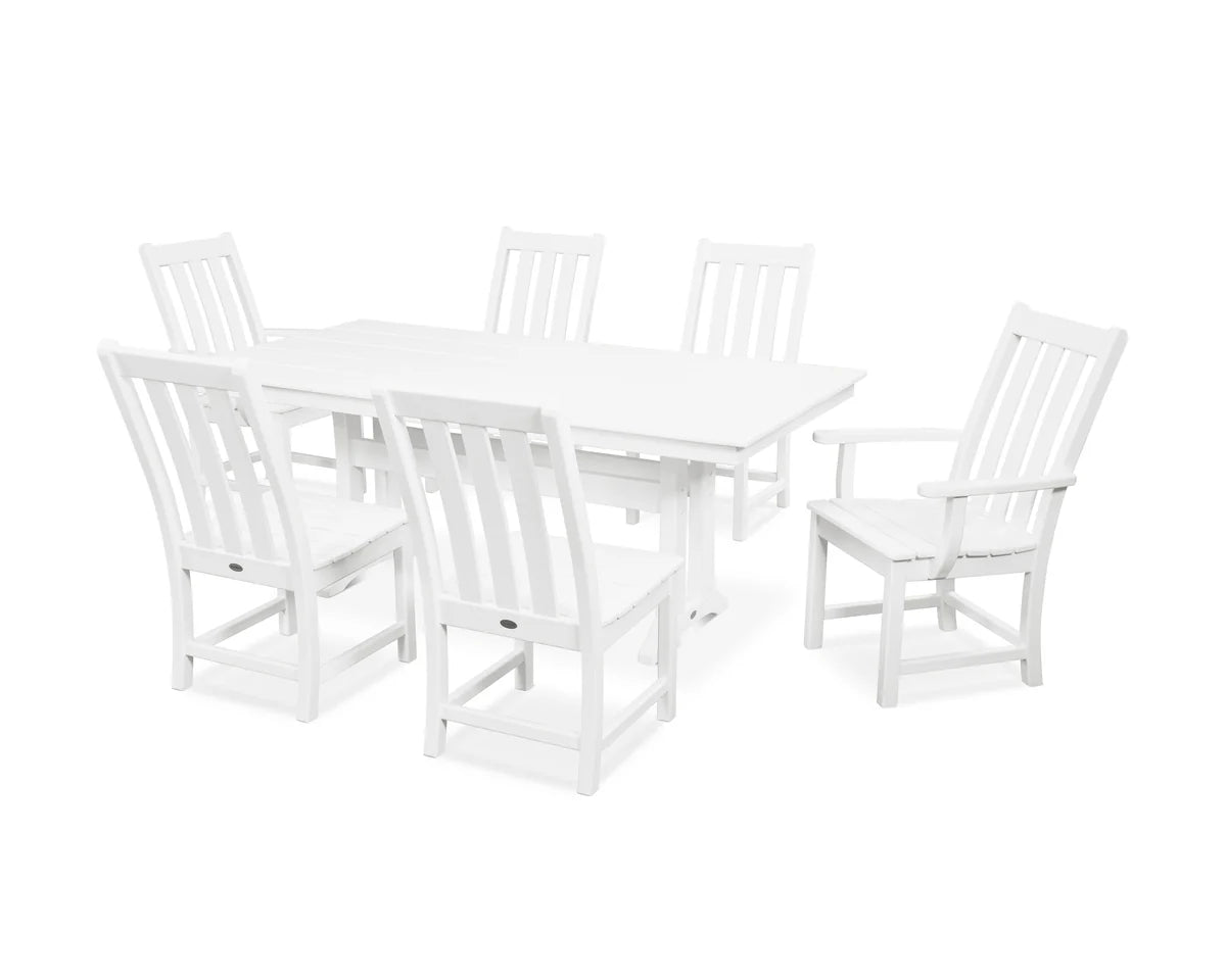 Our Vineyard 7-Piece Farmhouse Dining Set with Trestle Legs serves up outdoor durability with a side of refined style. Great for special celebrations, bigger families, and multiple courses, this spacious set comfortably seats six guests around a sleek plank-style table. These enduring designs are made for effortless alfresco entertaining, easily finding their place on sunny decks and sprawling patios.